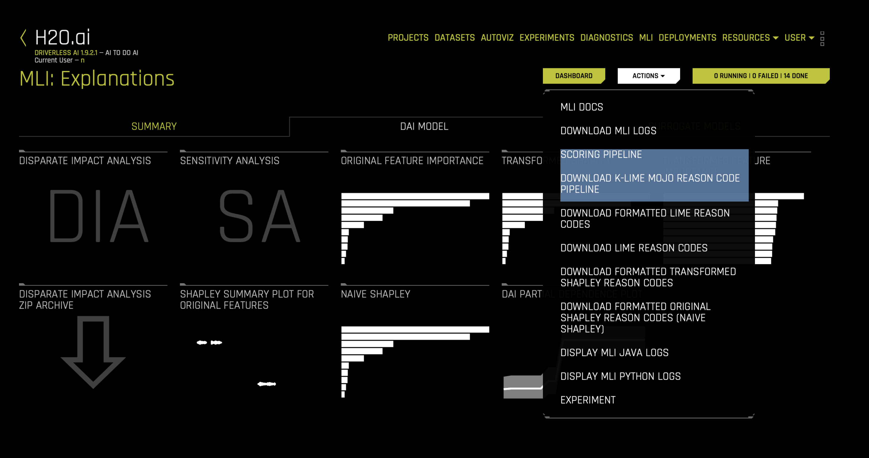 For completed MLI experiments, users can download the k-LIME MOJO. The k-LIME MOJO Reason Code Pipeline is a reason code engine that can be deployed in any Java environment to generate reason codes in real time. To obtain Java runtime MOJO for K-LIME reason codes, download K-Lime MOJO reason code Pipeline and for Python scoring pipeline for K-LIME reason codes and Shapley, download the Scoring pipeline.