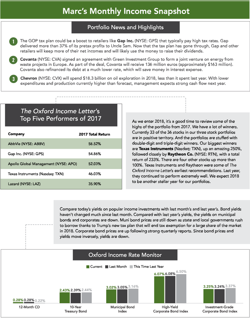 In that issue, I recommended investment bank and asset manager Lazard (NYSE: LAZ). Since then, it has returned 38% versus a 22% gain in the S&P 500. Apollo Global Management (NYSE: APO) is up 53% since it was recommended in February. Our lone bank stock, Northwest Bancshares (Nasdaq: NWBI), didn’t fare as well. Though we’re still up 43% on it, it had a slightly negative return in 2017.