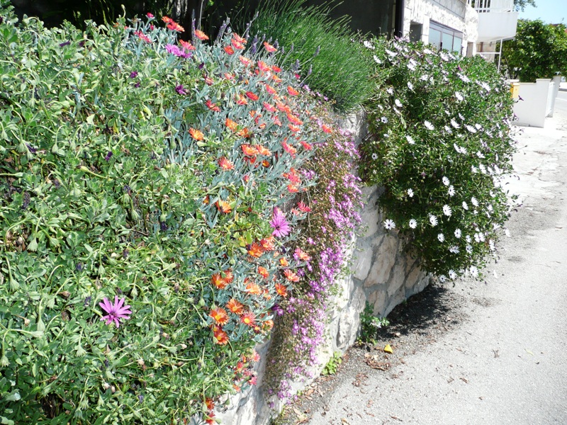 Pretty flowers on a stone wall |