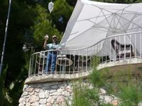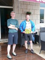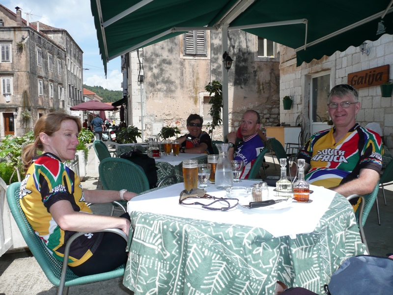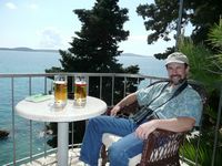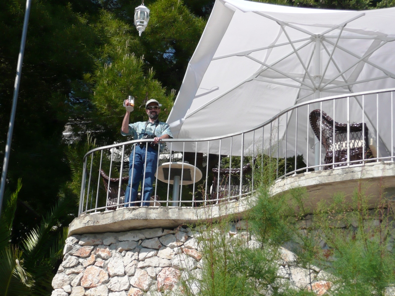 | Robert with our beer at the hotel, the Podstine, just outside Hvar town (about a 15-20 minute walk) |