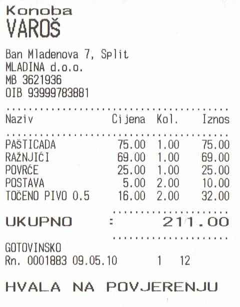 Lunch receipt from Varoš