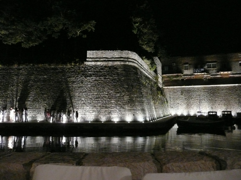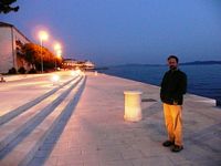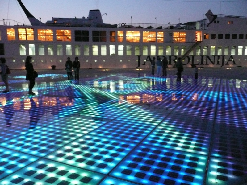 Sun Salutations - photovoltaic plates that produce marvelous light effects after sunset - with a large Jadrolinija ferry in the background |