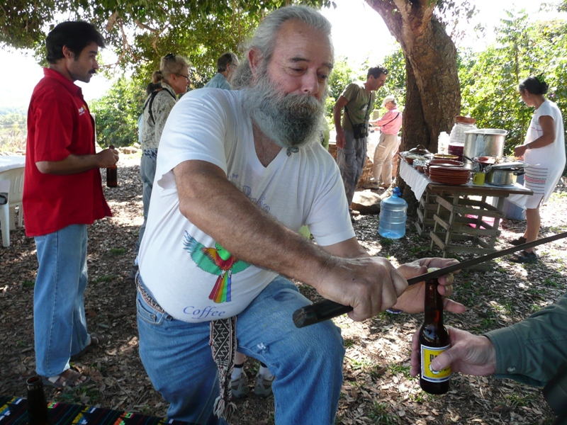 Daniel of Capulin coffee demonstrating how to open a beer with a machete |