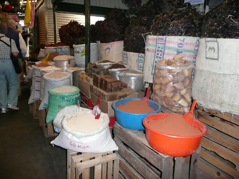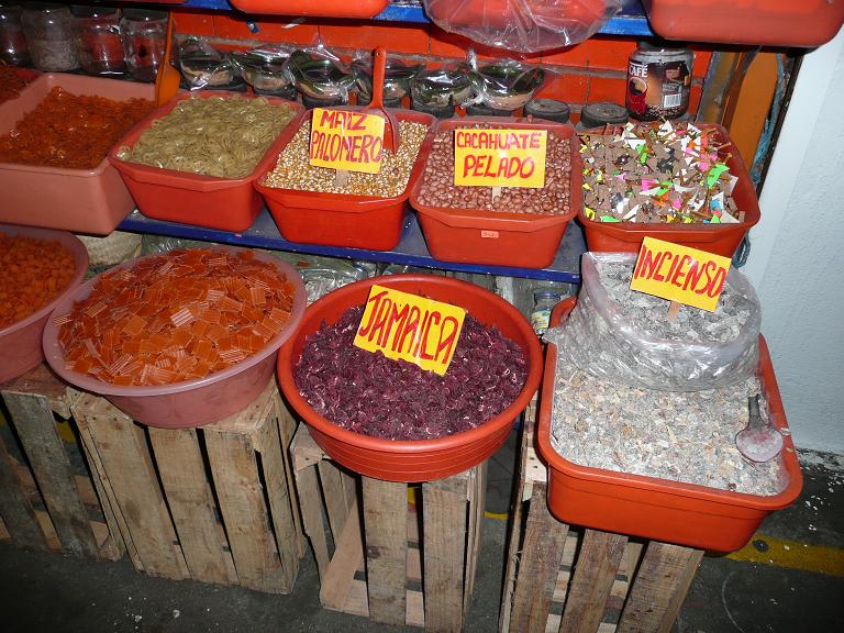 Bins of goods including jamaica