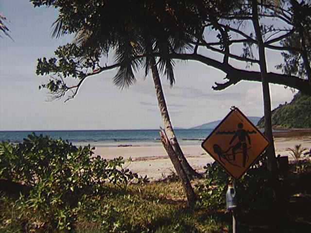 Armed with a very large picnic lunch, we left Coconut Beach a little after 10:00 am, and headed down the road, first stopping at Cow Bay, then the Daintree Environmental Center. We spent nearly two hours at the DEC, eating part of our huge lunch, and enjoying their visitor's boardwalk with many trees labeled and the exhibits within the building. We watched a BBC video there called "The Queensland Strangler" about the Daintree region and the local politics for and against development. I certainly tended to take a moderate approach; limited development (i.e., the Bloomfield Track [road] from Cape Trib to Bloomfield) is good, it allows people access to experience the rainforest for themselves and see why it is worth saving. The extremists on both sides -- either all access is BAD, or let's bulldoze it all and to hell with saving anything -- were ridiculous. A big issue in the area at this time is power; will the just-recently voted connection to "mains power" mean an onslaught of development and rainforest destruction? Power itself would not seem to be too bad. The more pressing problem would be the proposed removal of all development restrictions, individual landowners could then do exactly as they pleased. What a disaster that could be.