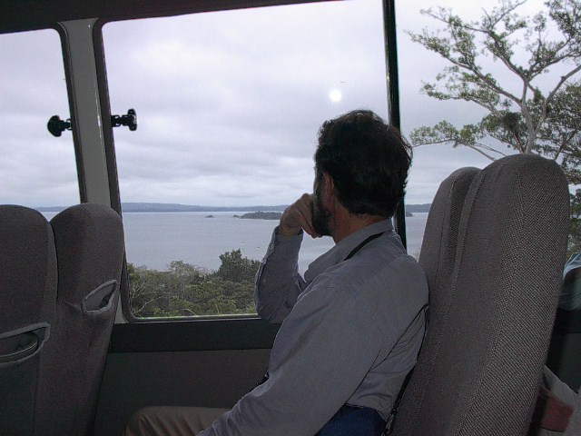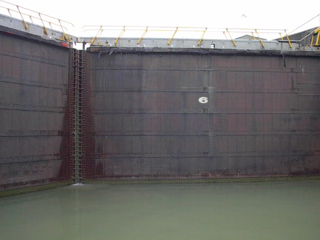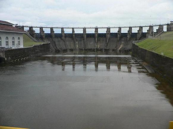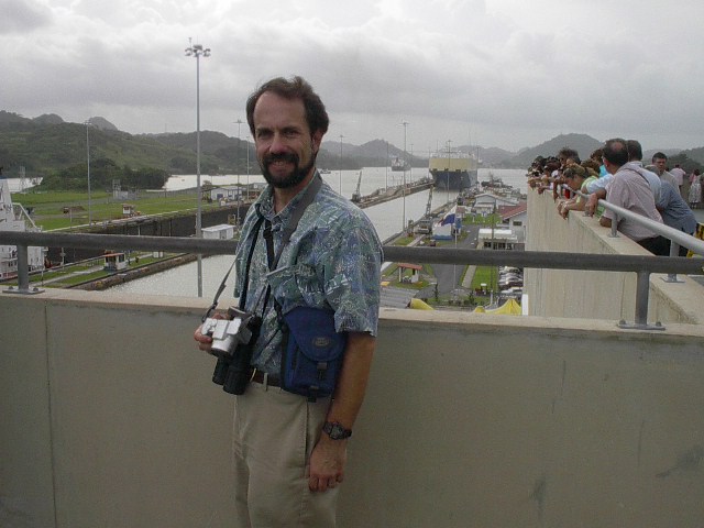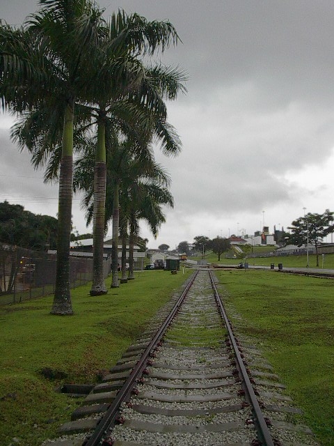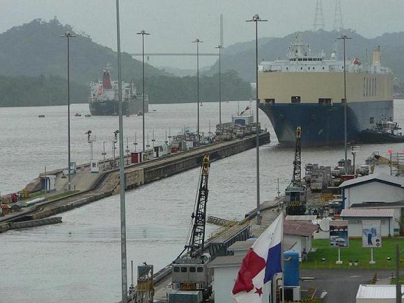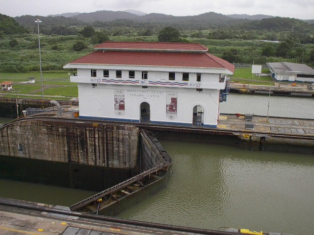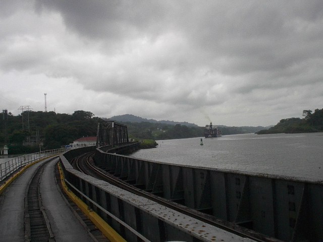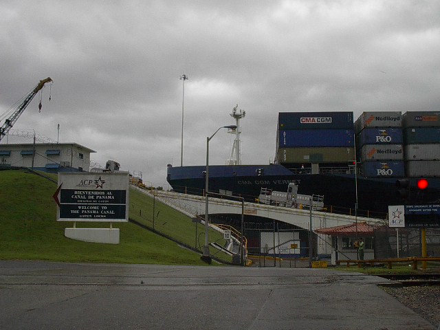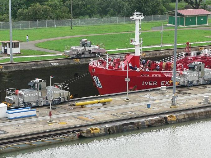 Ship coming into Miraflores Locks, note "mule" on RR tracks