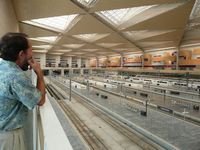 Robert checking out the trains at the Zaragoza train station on the way to Pamplona |