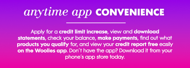 As a Woolies Credit Cardholder, you get rewarded wherever you shop, every single time you pay with your Woolies Credit Card. |