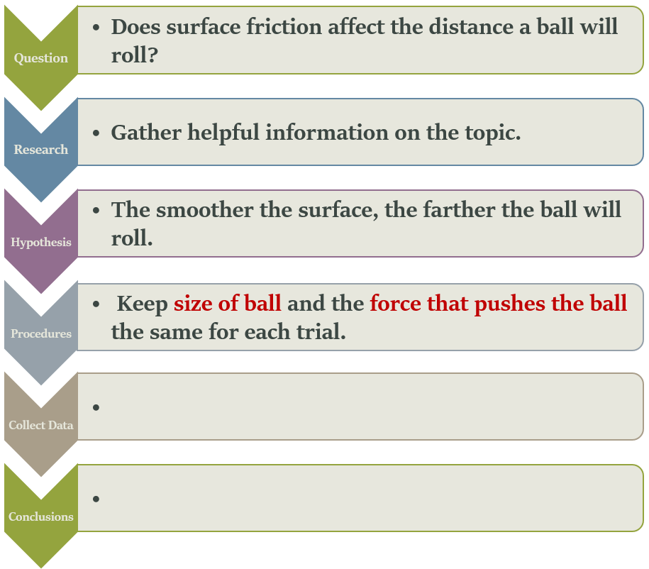 A group of 5th grade students wants to know how surface friction affects the speed of a rolling ball. To be sure that surface is the only variable that changes, they need to keep size of the ball and force on the ball the same. Can you think of anything else that should be controlled?