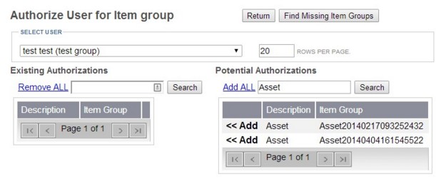 The User Item Group Authorization session is used to grant access to items that are associated with specific item groups.