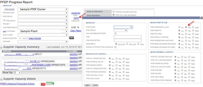 In the below example, all PFEP documents have been filtered by Owner and Customer. An additional filter has been set using the Advanced filter link. The system is reporting that a total of 2059 PFEPs have undefined Item Dimensions for all PFEPS whose Owner = Sample PFEP Owner and Customer = Sample Plant.