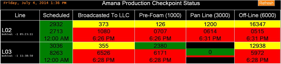 The Broadcast Status Board is available to be displayed on a large monitor on the production floor. The broadcast status board provides the status of orders that are being broadcasted.