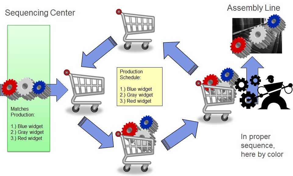 Let's take an example. A production line is producing three models of refrigerators each having different handle styles. Handles would be a commodity to be sequenced. A broadcast signal would be sent to the sequencing center to supply each handle at a certain time to the assembly line. In the below example, each colored widget represents a different handle style.