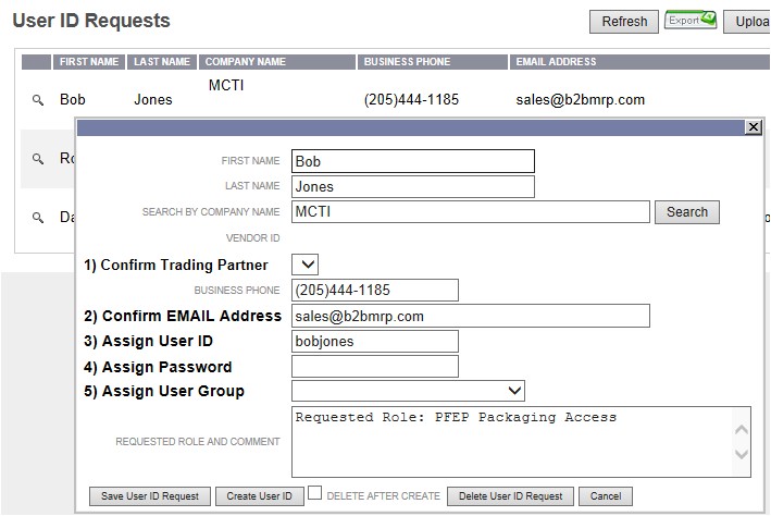 Processing a user request requires the administrator to step through a list as illustrated in the below example. In doing this the system will automatically create a contact or choose an existing contact in the system, attach the first trading partner data permission to the user ID, create a password and link the user ID to a user group.