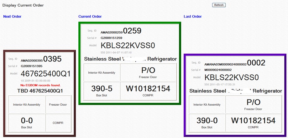 The example below illustrates different broadcast codes being used to assist an operator with building a certain model refrigerator coming down the line. The operator's display shows next order, current order and last order. Broadcast Codes appear in boxes under the Sequence ID, Serial Number and Model description. The broadcast sheet being used is defined with 2 rows and 2 columns allowing for four broadcast positions to be displayed each containing a unique broadcast code.