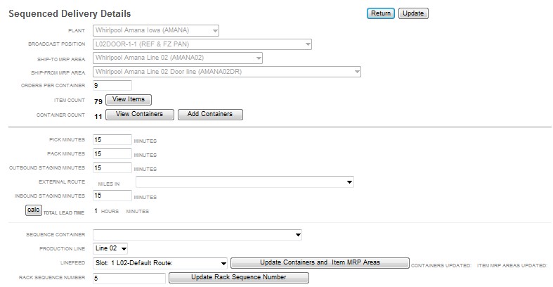 | Update Containers and Item MRP Areas | Updates the sequenced delivery record's sequenced racks and corresponding MRP Area Item records to the selected Sequence Container, Production Line, and Linefeed. |