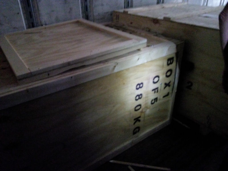 The top of the box containing the Bremsstrahlung shield stand. As this top-heavy crate fell, it pushed the square crate forward and had it's lid sheered off as it fell to the ground. (04/48)