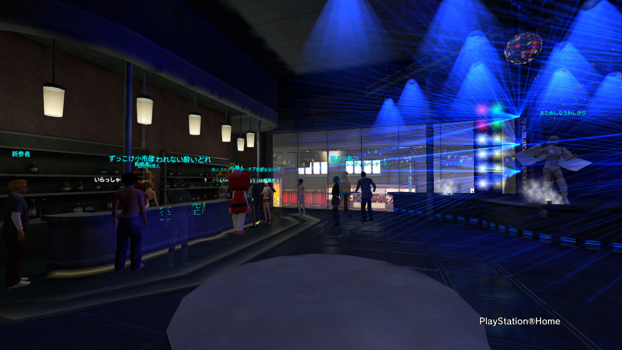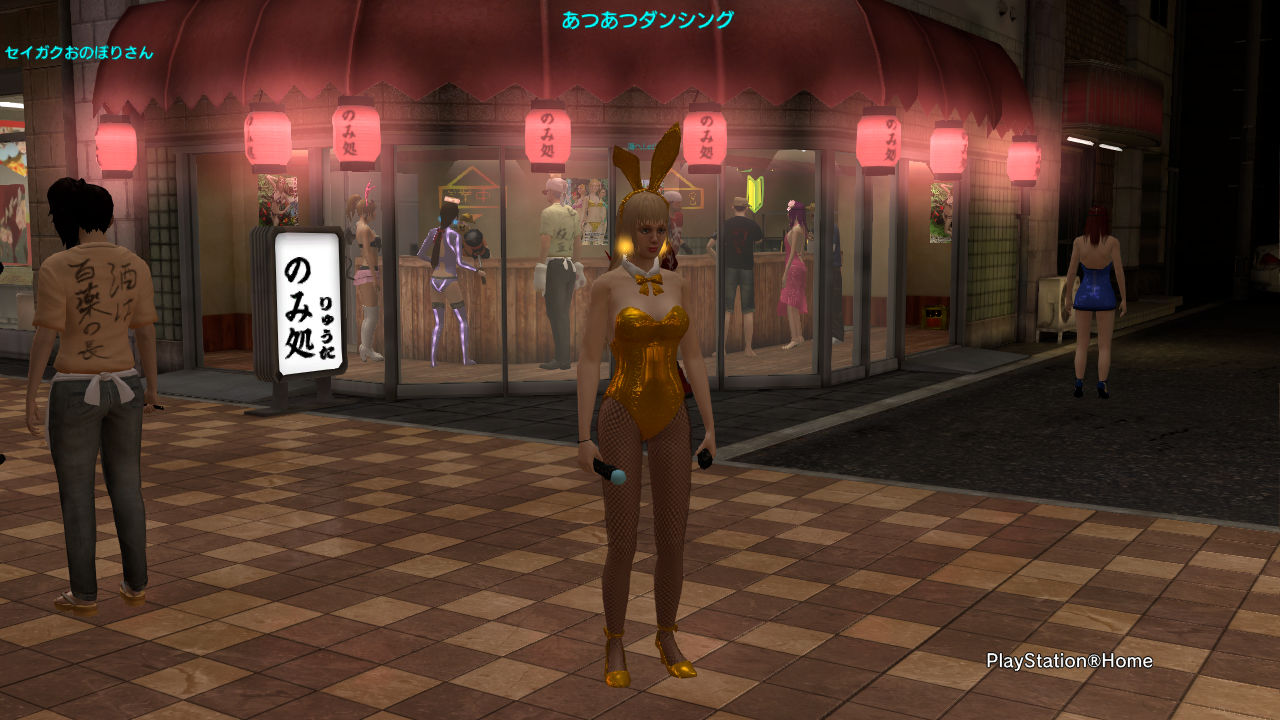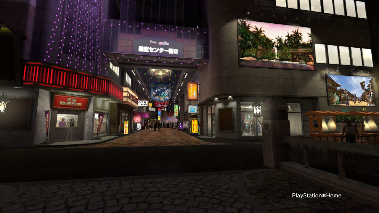 When you first arrive there you find yourself looking into a well-lit street ahead, one that is covered by a roof high overhead, sort of like an outdoor mall. There are bright lights everywhere, and more of the street stretches out behind you with NPCs in the distance. This is much like the Edo Village we now have in America Home. It makes you wonder if they might eventually open these areas as well like they have with Edo in Japan already. There are shops and an open food stall right ahead of you; the stall is a game and the shops have both games and retail stores available. You can walk right into them as you can with our mall now, and this adds to the realistic feel of the space.