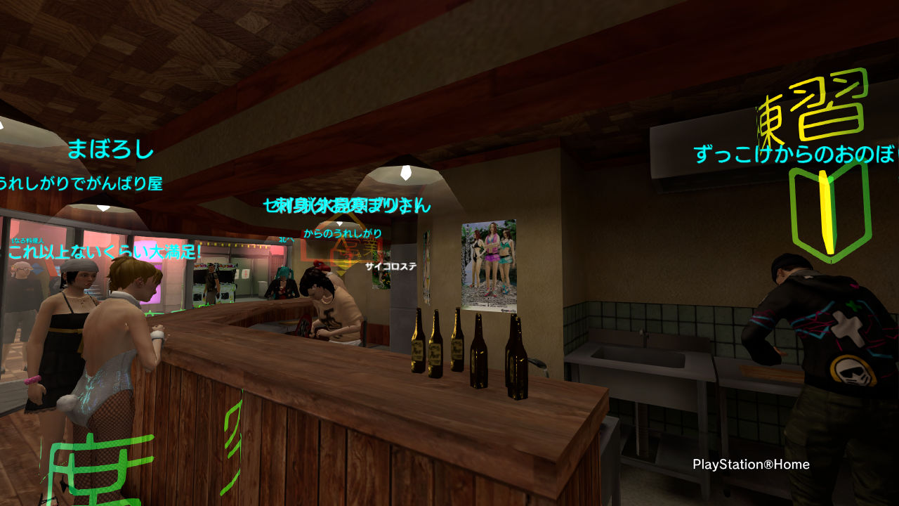 The games involved with earning your credits and “Happy Points” work like this. There are three different places you can “work” or be a customer. One is the outside food stall I mentioned before, another is a walk-in sushi restaurant, and the last is a bar/lounge with music and dancing. Each of them has a tutorial to teach you what you have to do to earn your pay and turn those into “Happy Points” by using the pay to buy things from servers, who are also players, and consequently buy the rewards you want at the information booth/store.