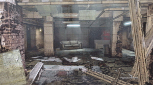 You arrive at this estate at the top of a staircase and walk down into one room of a nearly destroyed building with only a few items such as a table, couch and two sinks remaining from the devastation. Even the roof is mostly missing, allowing for a view of a sinister and gloomy cloud-filled sky. Several fluorescent lights flicker in a few spots there, allowing for a somewhat limited view of this space. There is another small room adjoining the larger one, that appears to be a hospital room – perhaps of the mental type – due to the little metallic bed, half-tiled walls, and small windows high up in one wall. You’ll enjoy the rattling door and other sound effects there and best of all, there is a full zombie outfit as a reward for you and your guests.