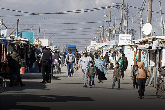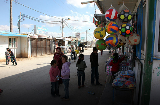 Crianças olham brinquedos na Champs-Élysées, a principal via de comércio do campo de refugiados Za’atari, no norte da Jordânia.