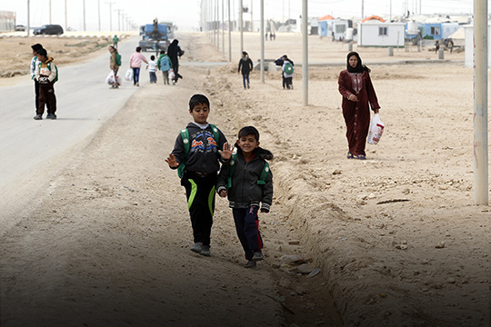 Crianças andam em via por entre tanques de água no campo de refugiados de Za’atari.