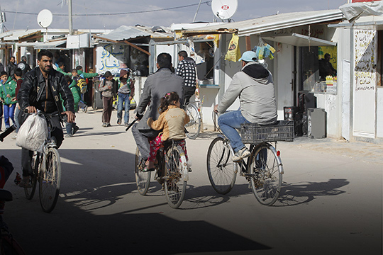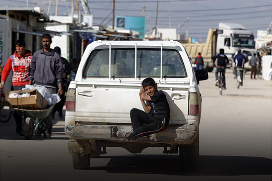 Jovem pega carona pendurado em carro no campo de refugiados de Za’atari, na Jordânia.