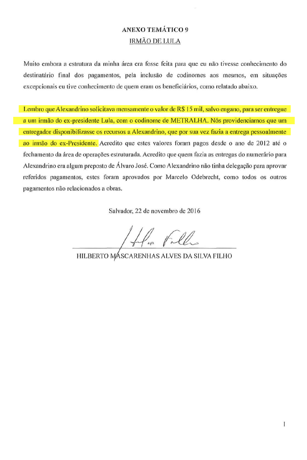 Hilberto Mascarenhas confirma que repassava dinheiro vivo a Alexandrino Alencar, destinado ao irmão de Lula, codinome "Metralha"