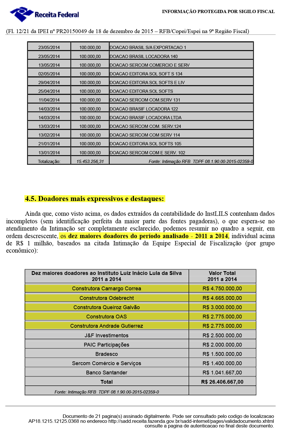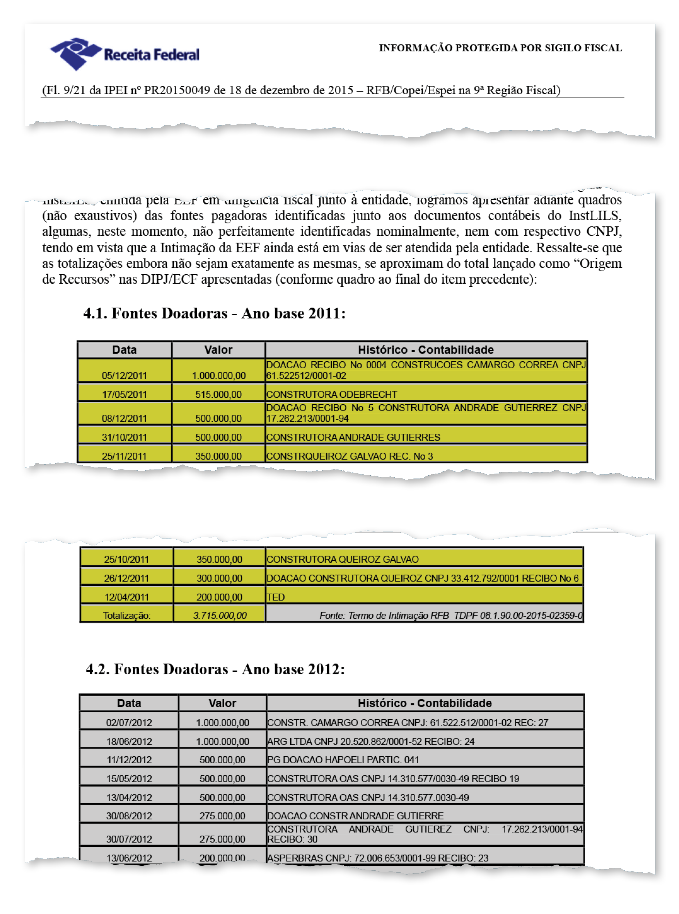 Receita registra que os cinco maiores doadores do Instituto Lula eram empreiteiras do cartel do petrolão