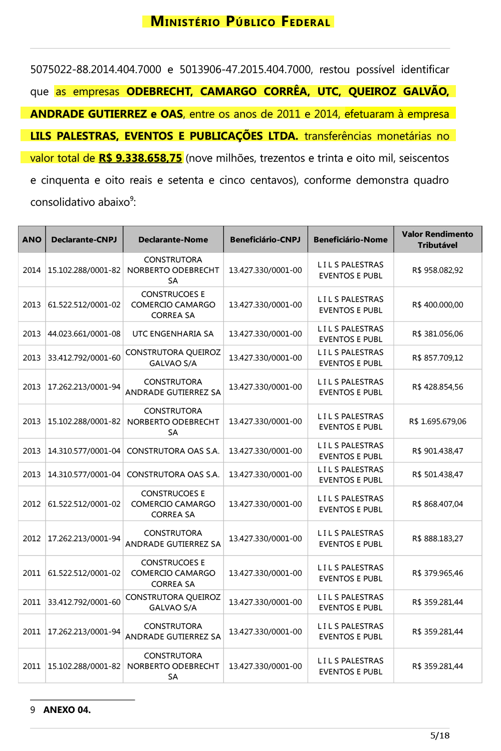 MPF registra, com base em documentos fiscais, que o cartel do petrolão repassou R$ 9,3 milhões à empresa de palestras de Lula