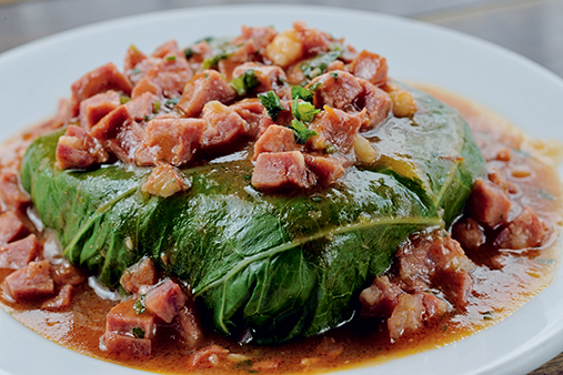 FARTURA. Trouxinha de couve com recheio de canjiquinha e queijo e molho de linguiça. Nos fins de semana, menu especial para o almoço
