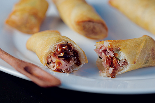INOVAÇÃO. Harumaki recheado com costelinha defumada e desfiada, com requeijão e ervas. Criações incluem o fondue de coxinha, com salgadinhos no queijo derretido