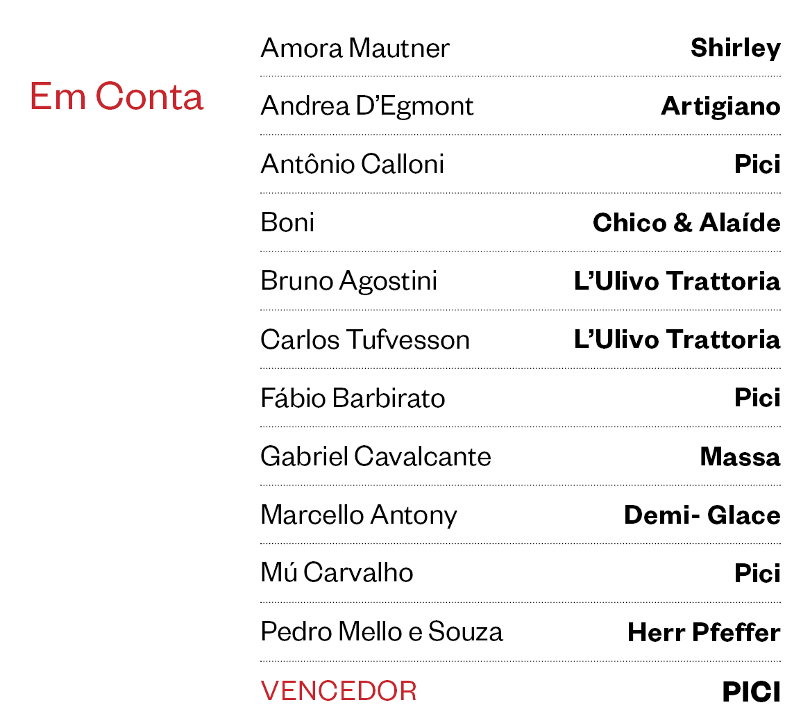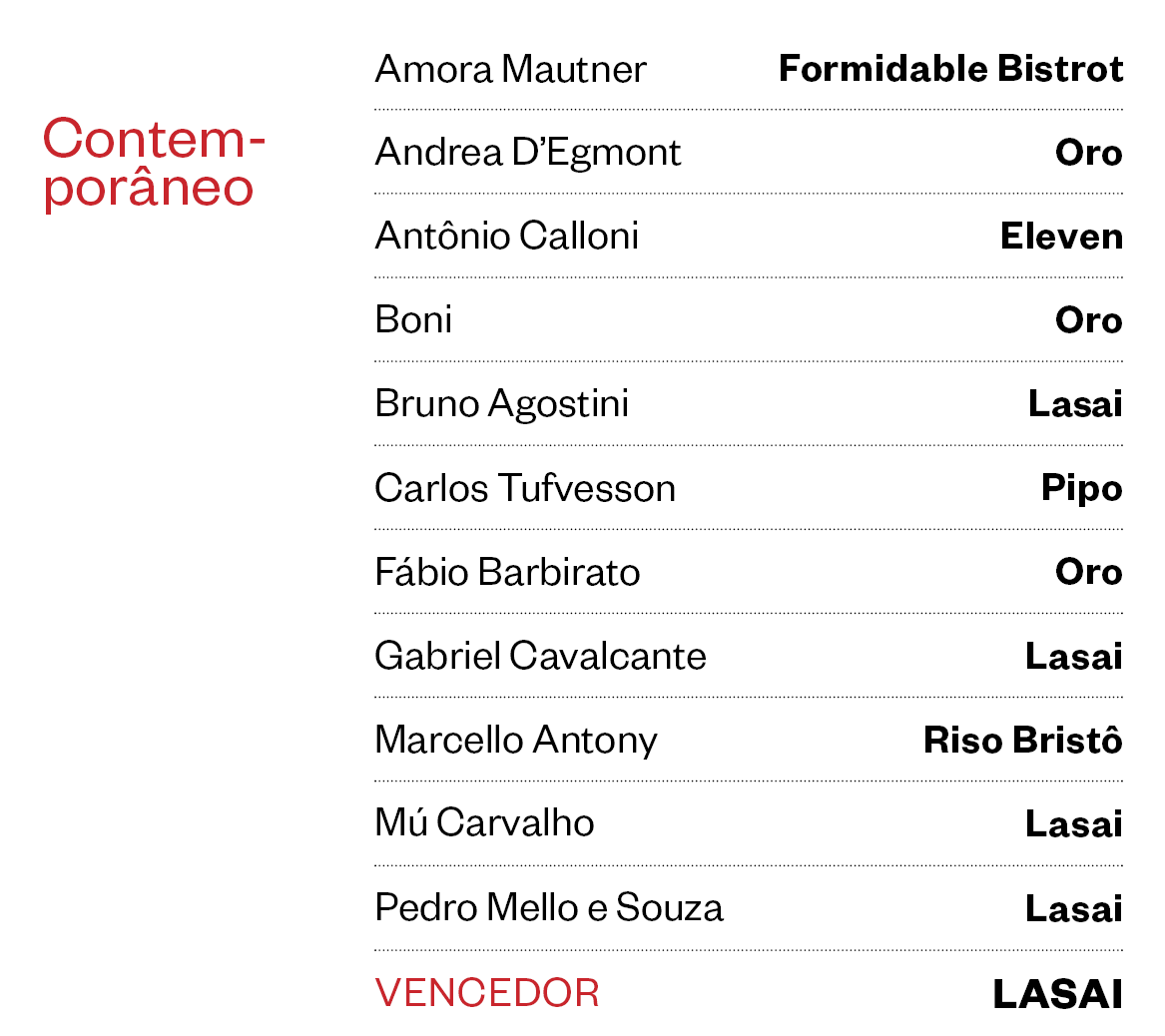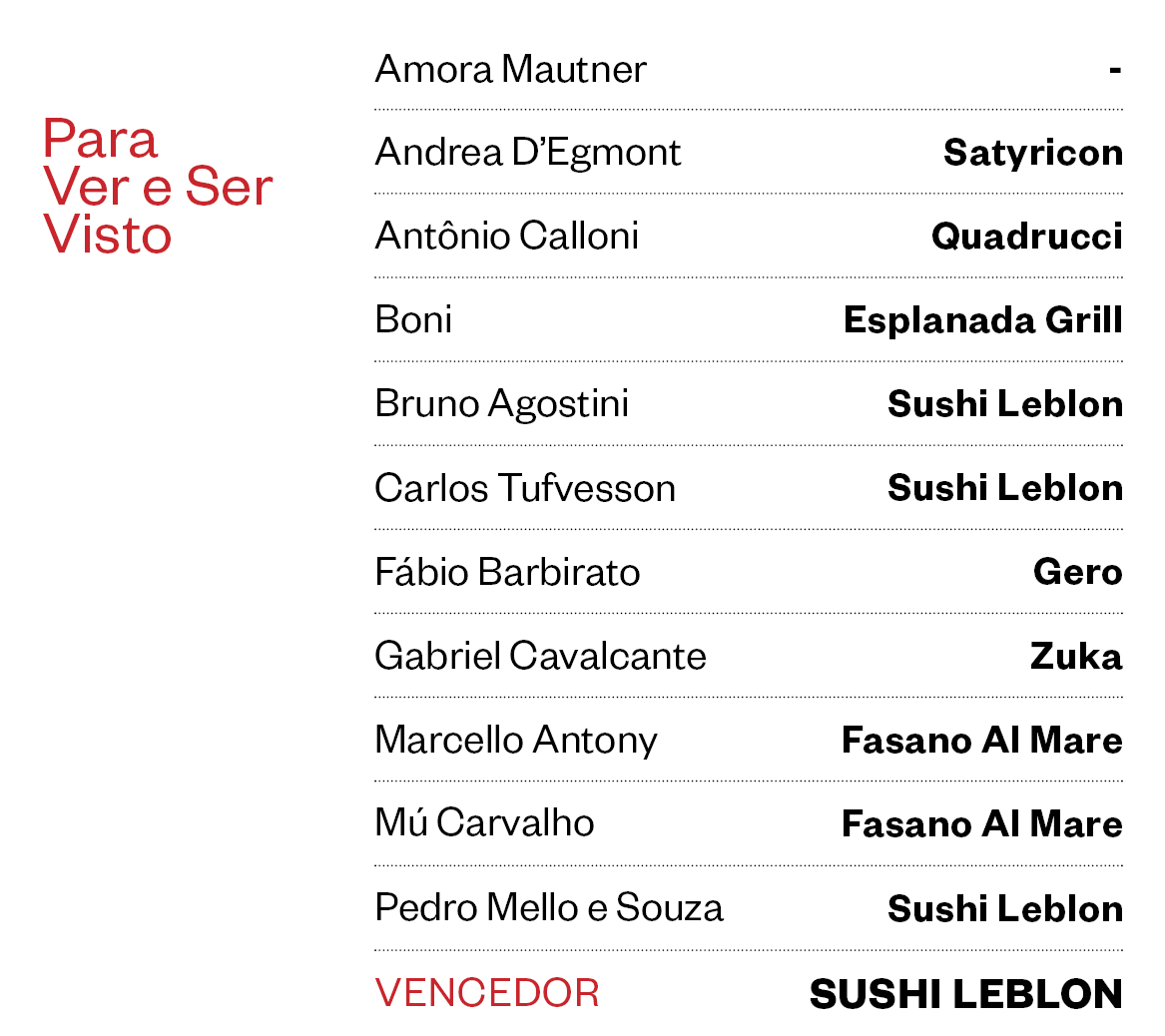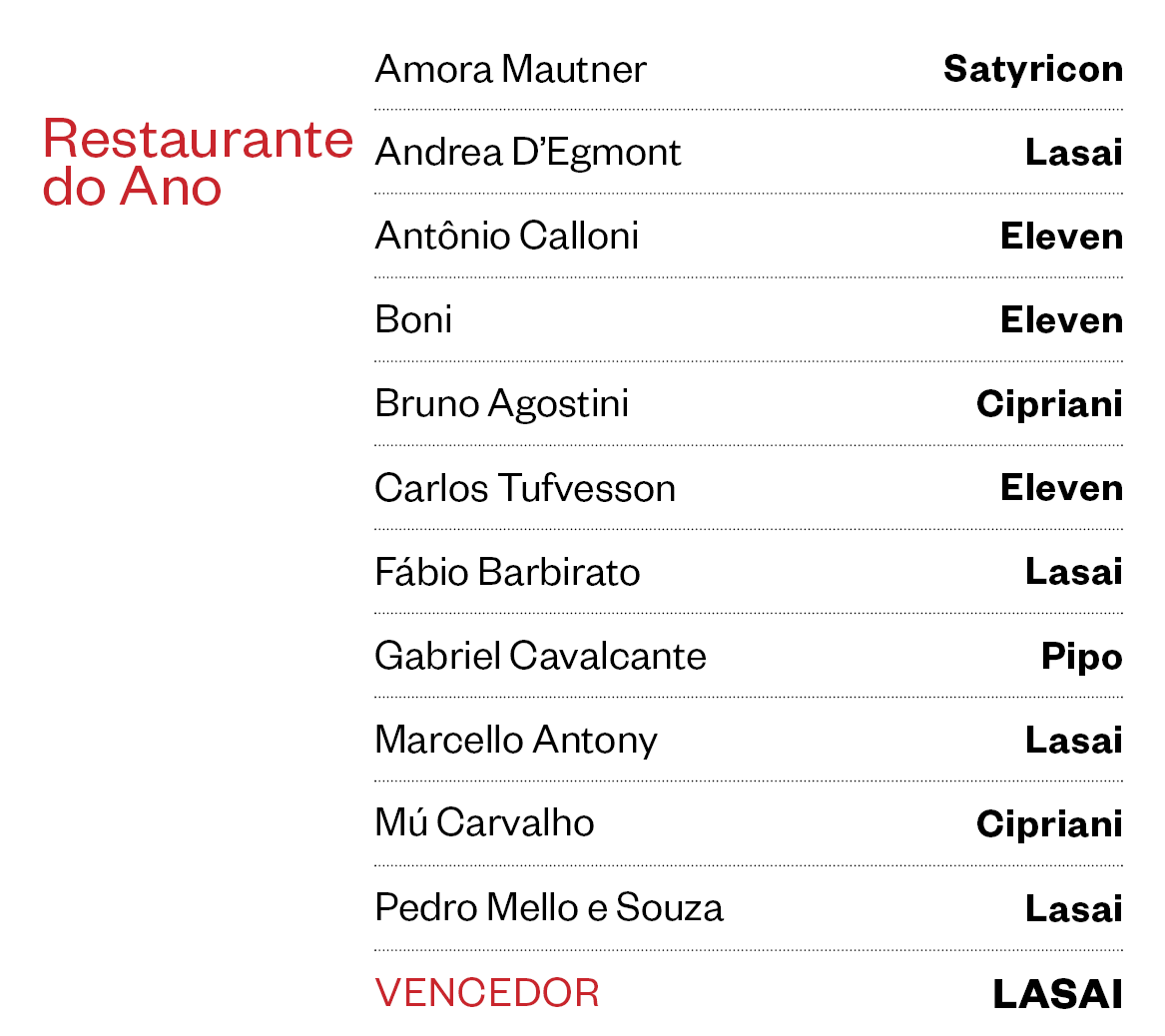 Eça Fechou as portas após a votação e pouco antes do fechamento desta edição.  Eleven Rio Filial do restaurante lisboeta, acaba de mudar para Ipanema, no endereço da antiga Casa Vieira Souto. Há menus-degustação impecáveis criados pelo alemão Joachim Koerper, com serviço e harmonização de vinhos. Destaque para o trabalho do sommelier Jorge Nunes, português.   Av. Vieira Souto, 234, Ipanema. Tel.: 2267-9282. elevenrio.com.br