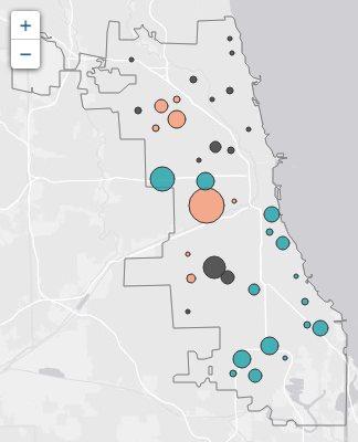 This map shows which Chicago high schools have the highest percentage of JROTC enrollment. Data and interviews showed that schools that are majority Black or Latino generally have the highest percentages of students enrolled. The largest bubbles on the map have the largest enrollment.