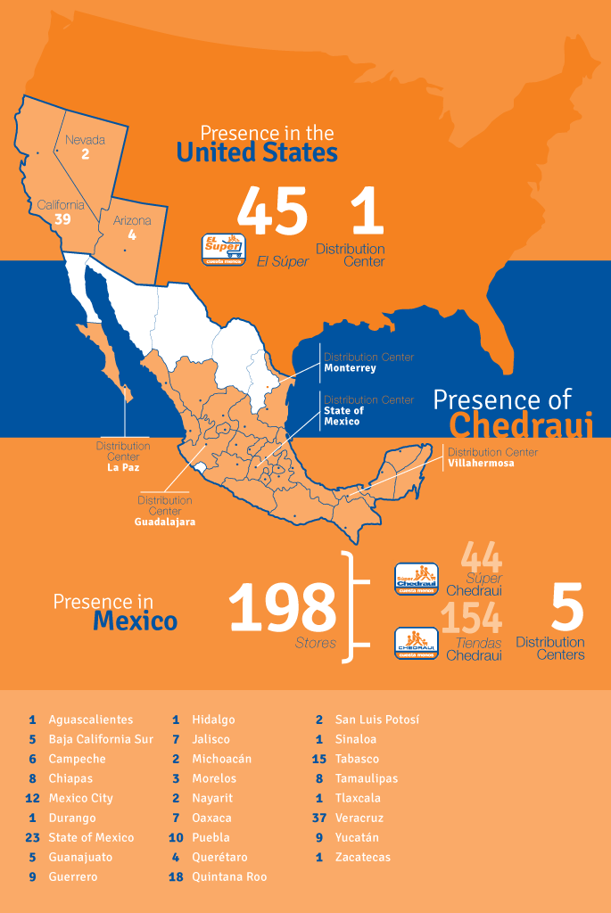 Chedraui today is the third largest food retailer in the country with 198 stores in 26 states in the Republic with growth in sales of 10.6% in 2012. The Company operates two formats of hypermarkets that vary in size and assortment range: 154 Tiendas Chedraui and 44 Súper Chedraui. We have incorporated the Selecto concept in our stores in recent years that is aimed at the highest socioeconomic level of the population.