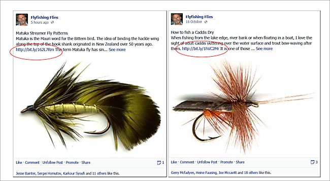 Look at the above two examples of posts on my fly fishing shop facebook pages. You will notice that the photographs are huge and attention grabbing plus the links to the product page are visible. I have put a red line around both links. You can see the words "See more" at the end of the truncated paragraph. When that is clicked by the reader the page expands to reveal the full article. If I had placed the link at the bottom of the article or any further down it would not bee seen by those readers skimming through the recent posts on his phone or tablet to find something interesting to read. Also note that at no time in these posts am I trying to overtly sell anything. There are no prices visible. I talk about the product. It's history and how to use it effectively. This will hopefully excite interest in the fishing fly and lead to the reader clicking the link to make a purchase.