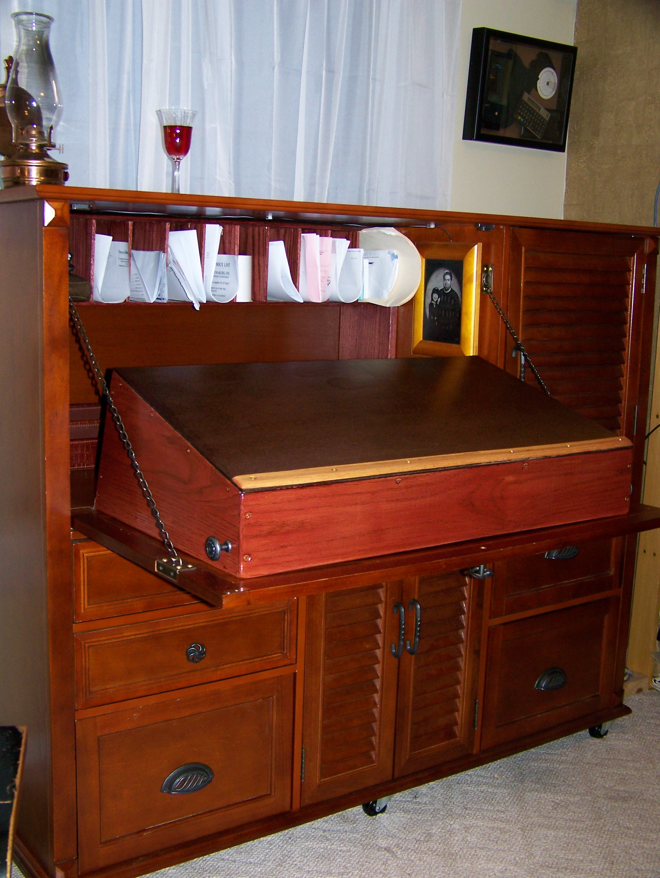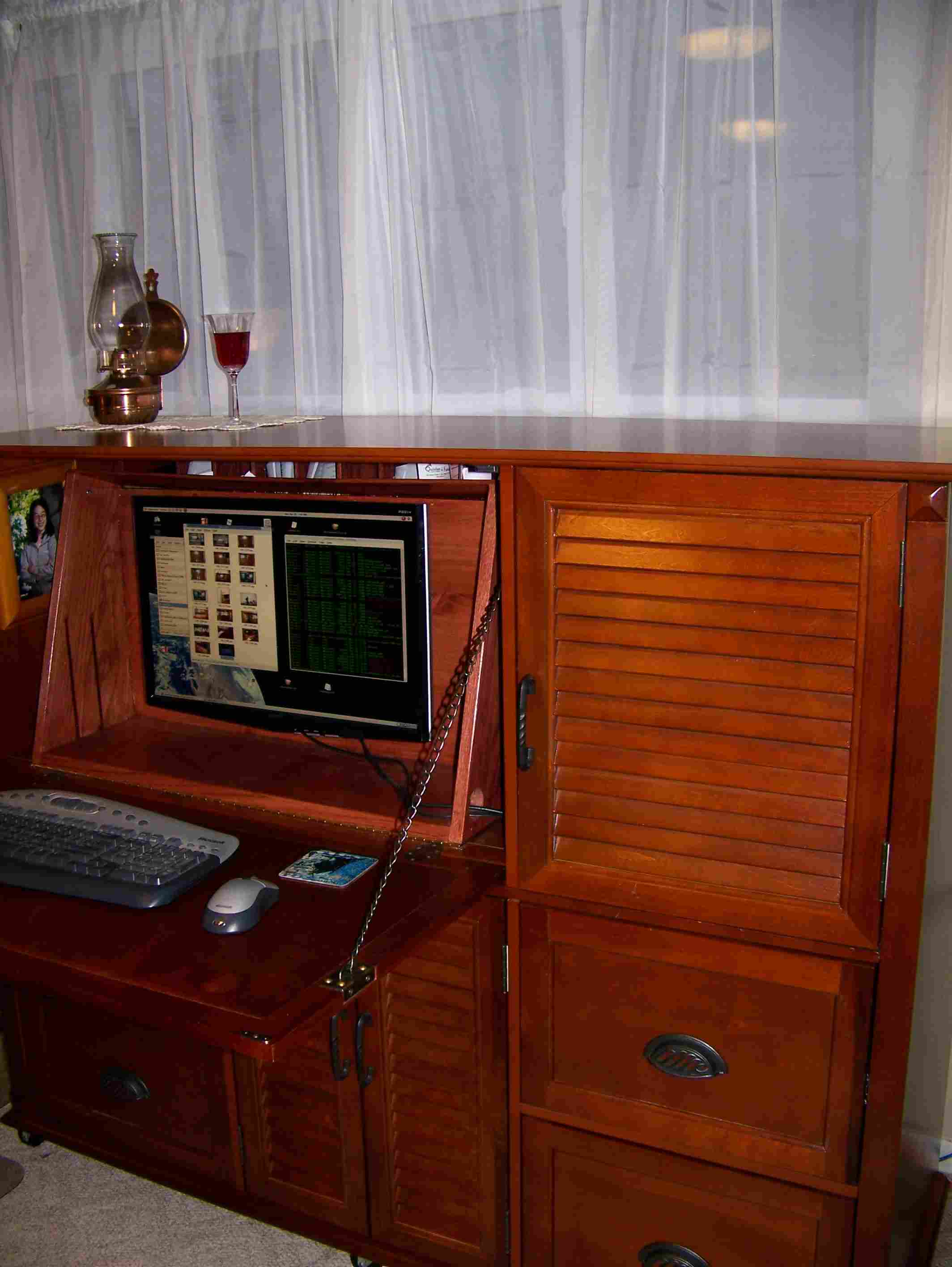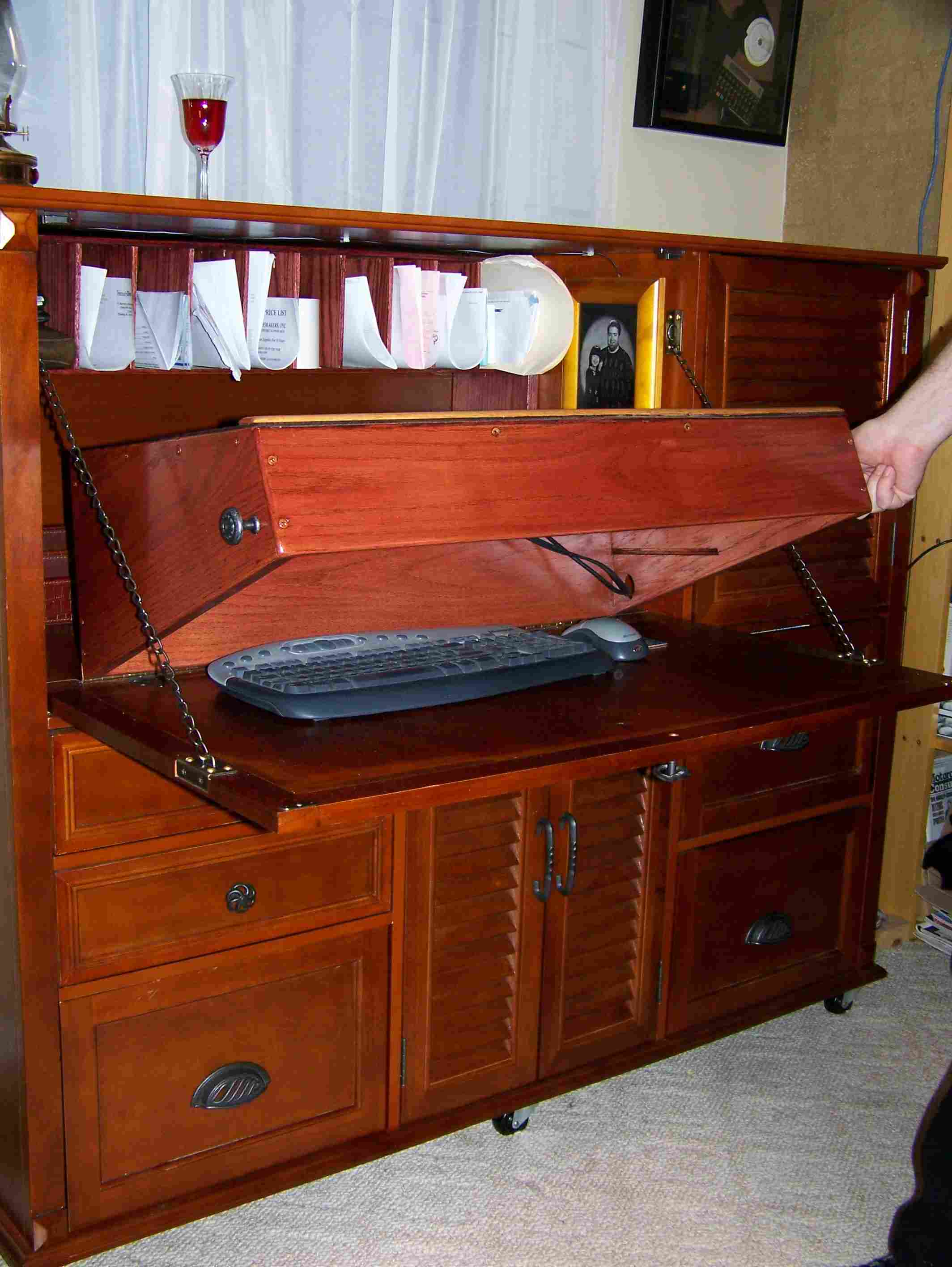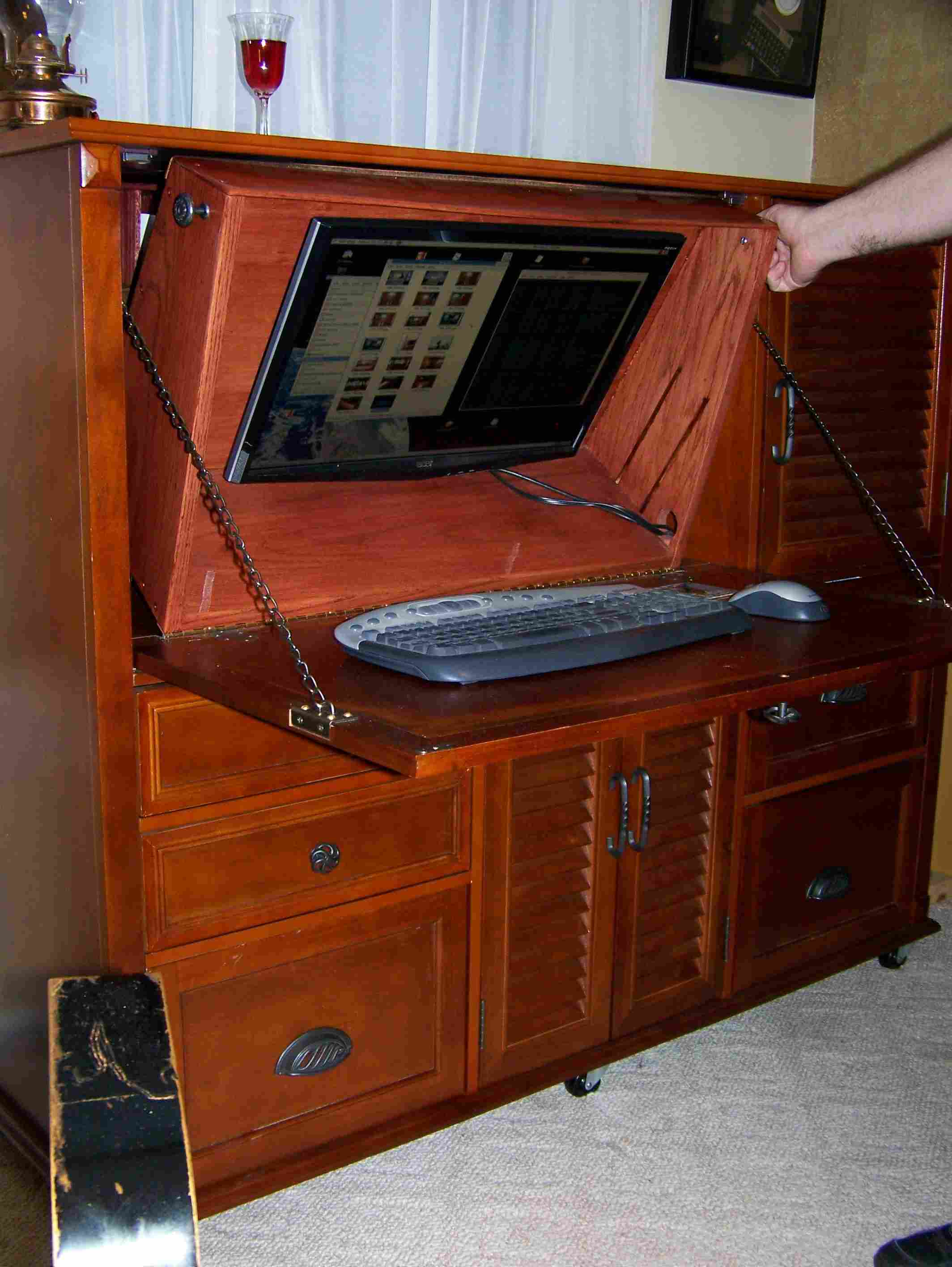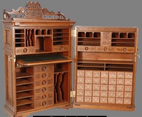 Several years ago, I become fascinated by Victorian cabinet desks. Although I do like these desks, they are impractical for housing a computer. A decade ago I adapted a purchased secretary desk to incorporate the benefits of both a Cabinet Secretary desk somewhat like the Moore Office Queen and the Davenport style writing desk which also has a space for a built in flat panel monitor.