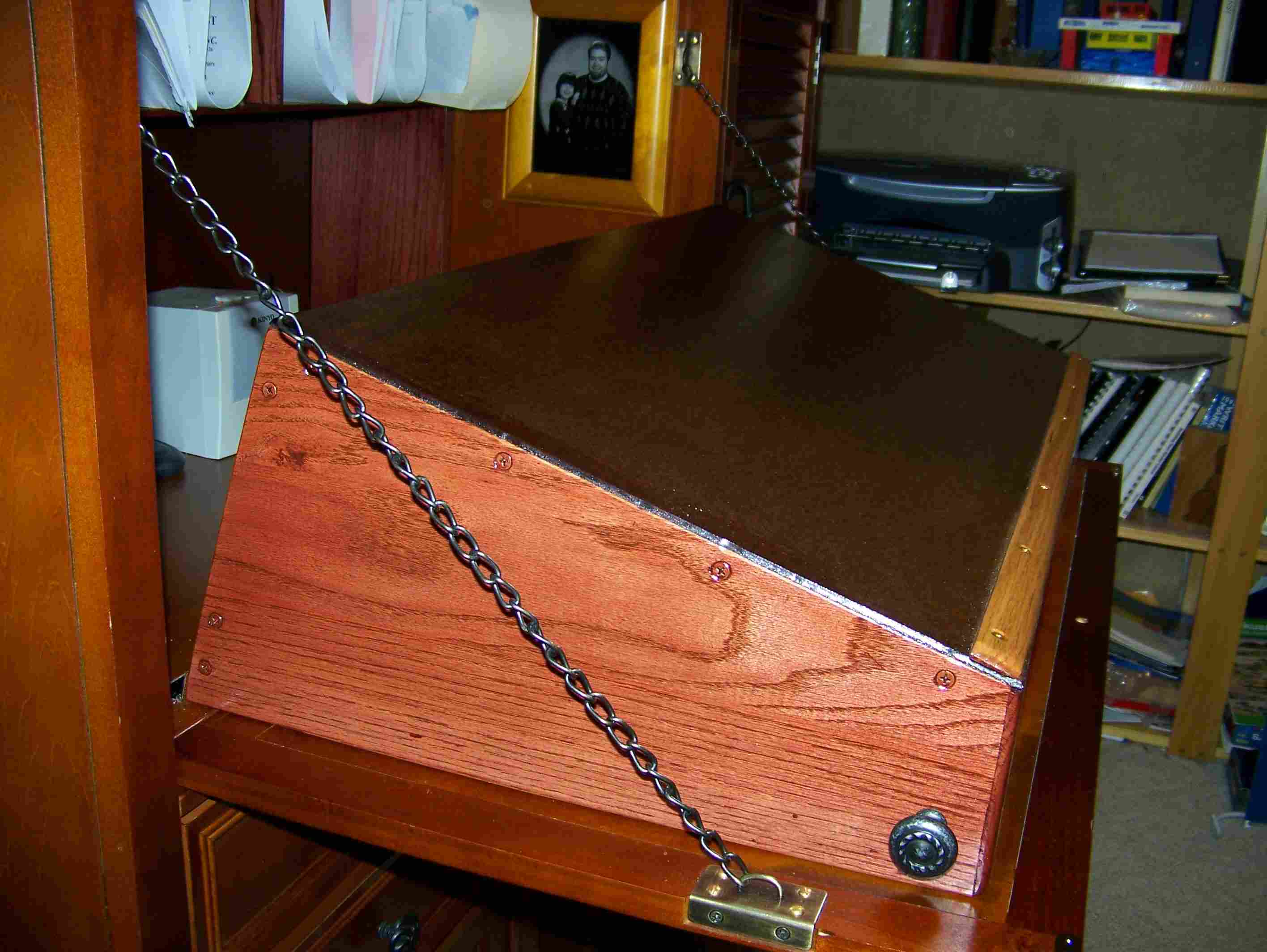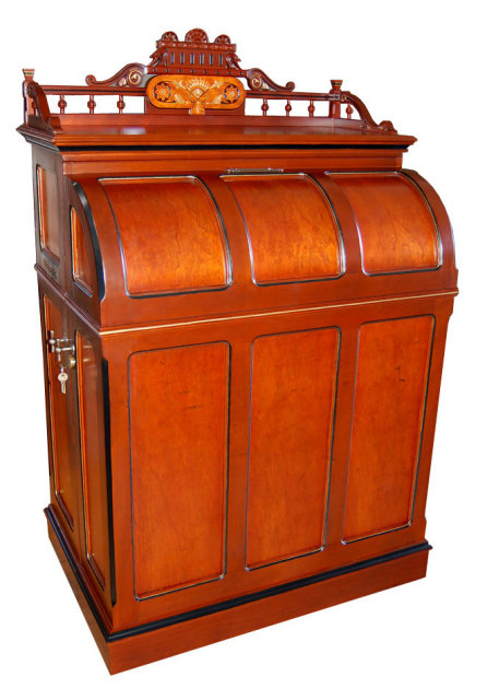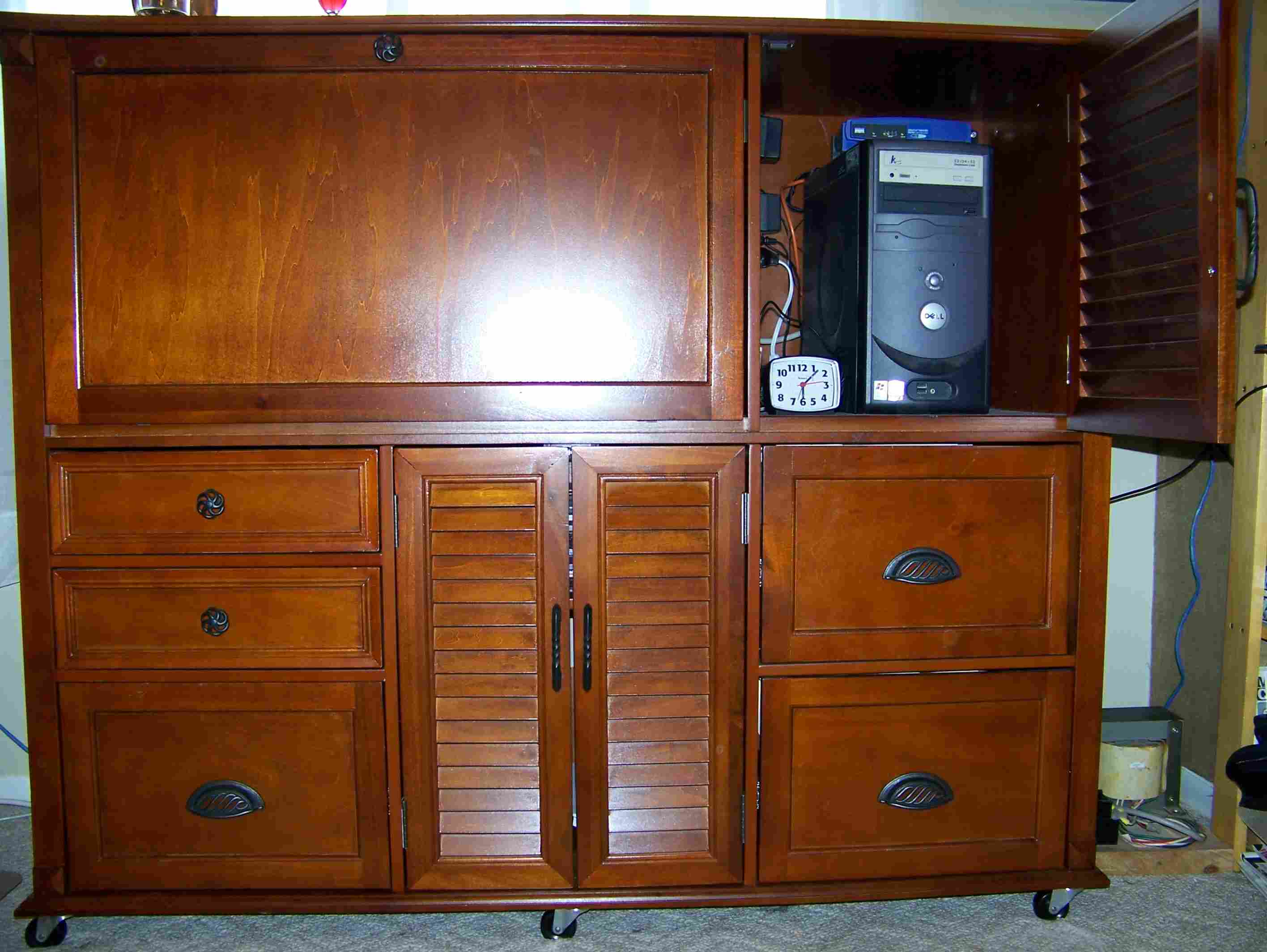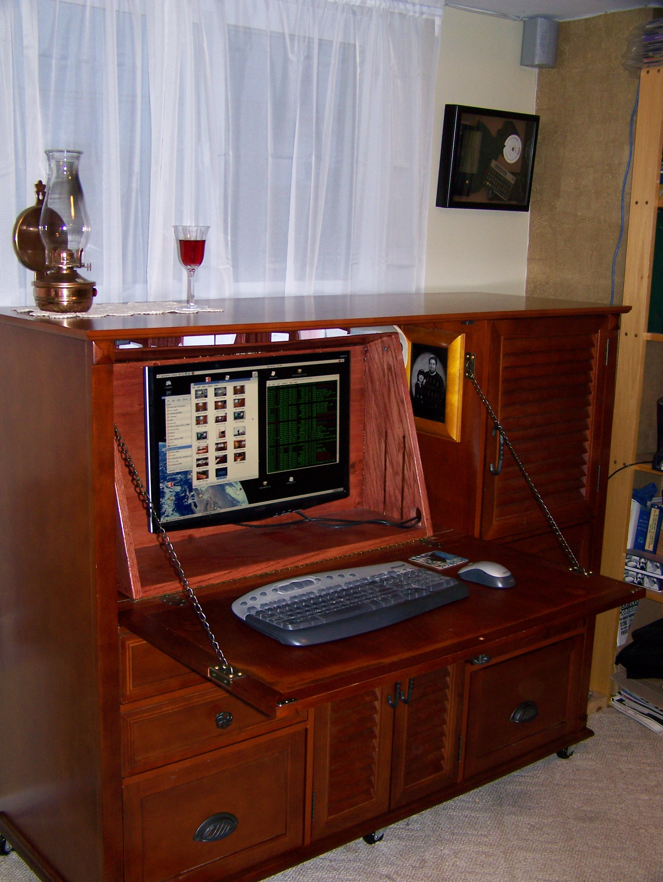 Several years ago, I become fascinated by Victorian cabinet desks. Although I do like these desks, they are impractical for housing a computer. A decade ago I adapted a purchased secretary desk to incorporate the benefits of both a Cabinet Secretary desk somewhat like the Moore Office Queen and the Davenport style writing desk which also has a space for a built in flat panel monitor.