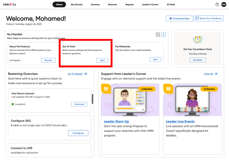 1. In the HMH Ed™ banner, click the Home tab and then in the Our AI Tools card, click the Start button.