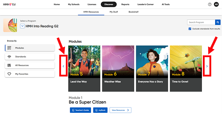 1. In the Ed banner, click the Discover tab. The HMH Resources tab of the Discover page appears.