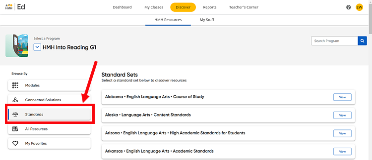 1. In the Ed banner, click the Discover tab. The HMH Resources tab of the Discover page appears.