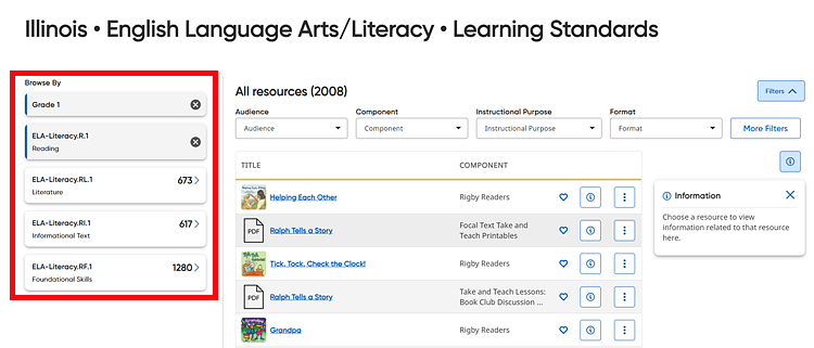 – Select a domain and/or additional standard breakdown. Your selections appear as gray boxes at the top of the Browse By panel, and the page updates the resources listed to match your selections.
