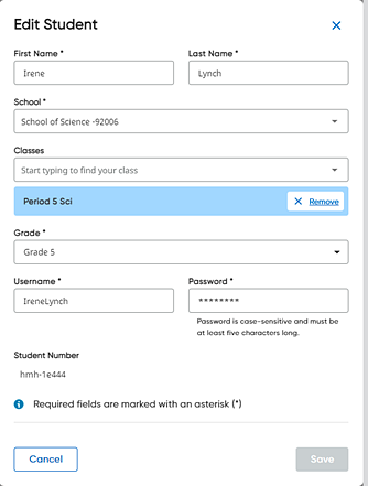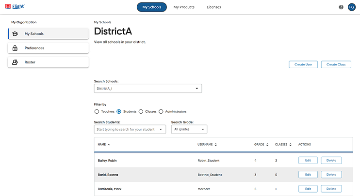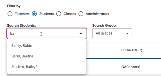 2. Click the Students option button. The Students page appears and lists all the students for the selected school.