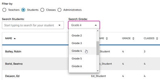 – In the Search Grade list box, click the down arrow and select a grade level.