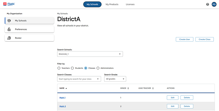 2. Click the Classes option button. The Classes page appears and displays the list of classes for the selected school and the grade level associated with each class.