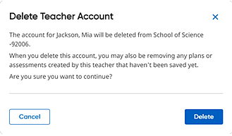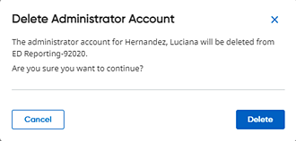 Note: ● School administrators can only delete accounts for users within their assigned school. If a user is tied to more than one school, the school administrator is not allowed to delete the user account. ● Administrators cannot delete their own account. When an administrator views the Administrators page, the Delete button does not display for the administrator's own account. ● Deleting