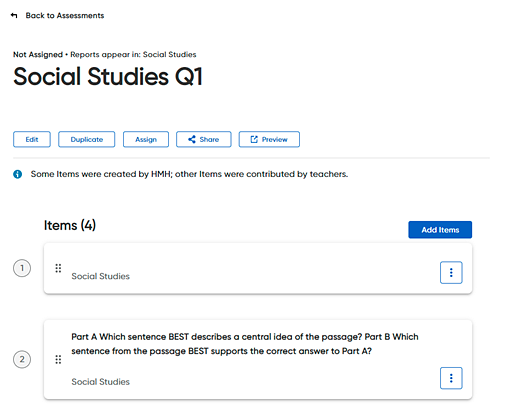 Note: 1 Not all items are available to be added to a custom assessment. 2 Assigned custom assessments cannot be changed. You can, however, make a copy of an assigned assessment and then add items and edit the duplicate version. See View or Duplicate Custom Assessments for details. |