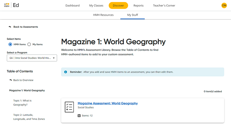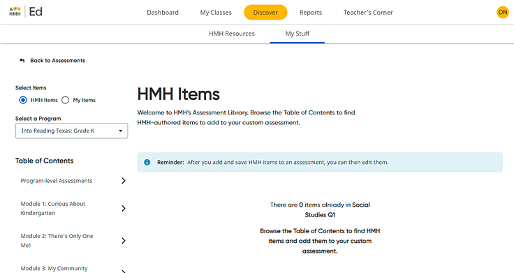 A On the left panel, verify that HMH Items is selected. (This is selected by default when the page opens.)