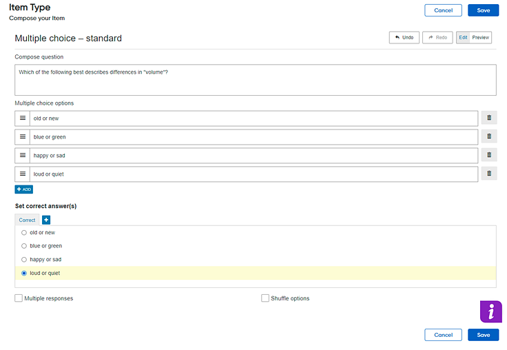 A In the box provided, type the question or instructions. B In the Stems and Options boxes, type the stem statements and answer choice options. C To remove a stem or an option, click the Remove attribute button D To include additional stems or options, click C If the question allows for more than one answer choice, select the Multiple responses check box. D In the Set correct answer(s) box, specify the correct answer(s). As you create the item, it displays at the bottom of the page. |