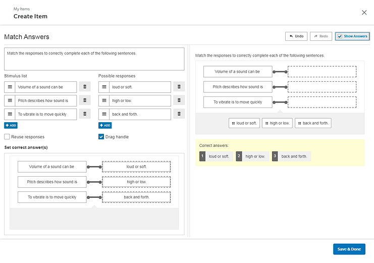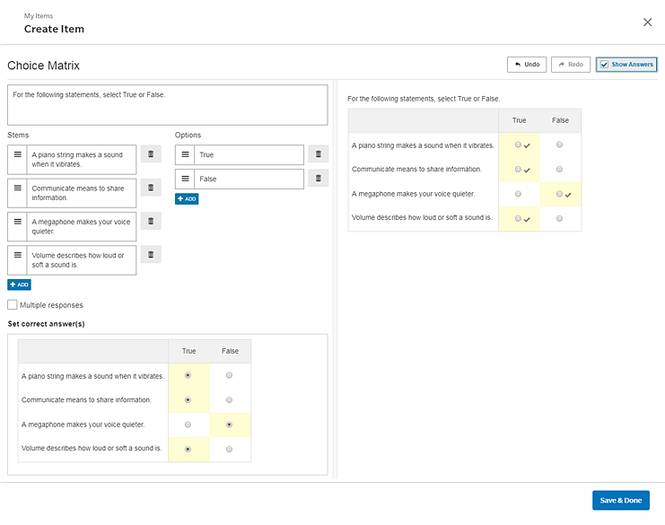 6 Click Save & Done. The newly created item can be viewed in the My Items list on the Create page and can be added to custom assessments. (See Add Items to Custom Assessments for details.)